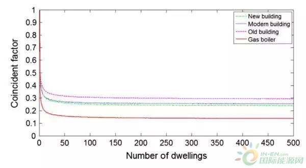 并不是的。因为居民用电的习惯是分散的,多户居民不大可能同时使用其所有的大功率电器。那么我们来算一个叫做coincidence factor (同时率),将区域叠加后的每户平均峰值与单一用户的峰值做一个比较(注意此图[2]数据不具备实用性,仅用于解释现象):