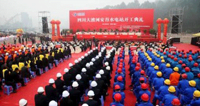 四川省副省长陈文华,中国电建集团董事长范集湘,乐山市委书记唐坚、市长蒋辅义,以及国家环保部、四川省政府相关部门领导及业主、设计、施工、监理代表和当地民众千余人参加开工典礼。