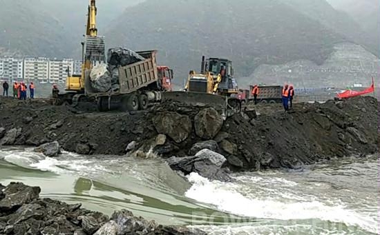 在反铲、推土机的配合下满载戗堤备料的自卸车向上游围堰龙口发起了冲锋。一块块巨石倾泻在奔腾而下的汉江水中,溅起重重浪花。在项目领导班子的有序指挥下,围堰缓缓向龙口挺进。经过项目部全体员工的努力,奔腾不息的汉江水被拦腰截断。此时,汉江两岸礼炮齐鸣,掌声雷动,业主、监理、设计及当地政府相关人员对水电三局孤山项目部成功实现大江截流表示衷心的祝贺。