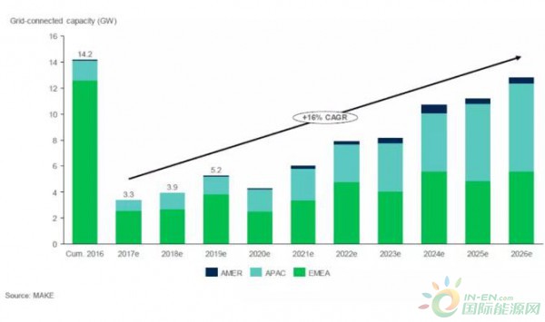 预计2018年,全球共计将新增3.9GW海上风电并网容量,中国海上风电项目的施工速度加快、欧洲市场进一步的成熟发展将成为主要推动力。MAKE预计2017-2026年间,全球海上风电产业将稳健发展,复合平均增长率将达到16%。
