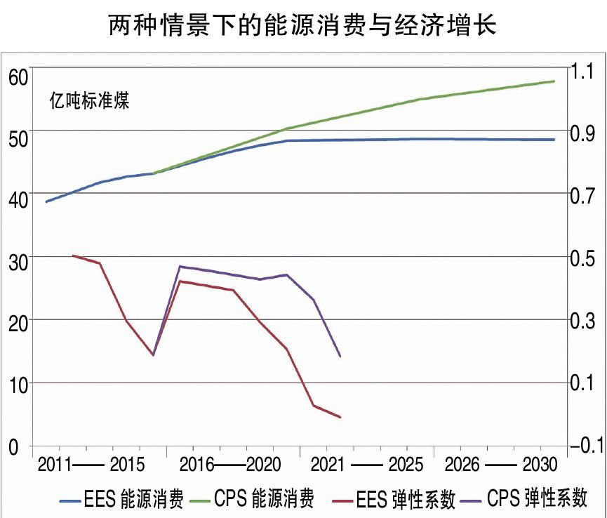 我们发现,在CPS情景下,从2015年到2030年中国能源需求将以1.97%的速度持续增长,在展望期(2011-2030年)内未见需求峰值或高峰平台。而在EES情景下,由于经济增长相对放缓,结构调整加大和效率提升,中国能源需求将于2020年后进入高峰平台,并至少维持至2030年,且能源需求总量低于同期的CPS情景下的总量。