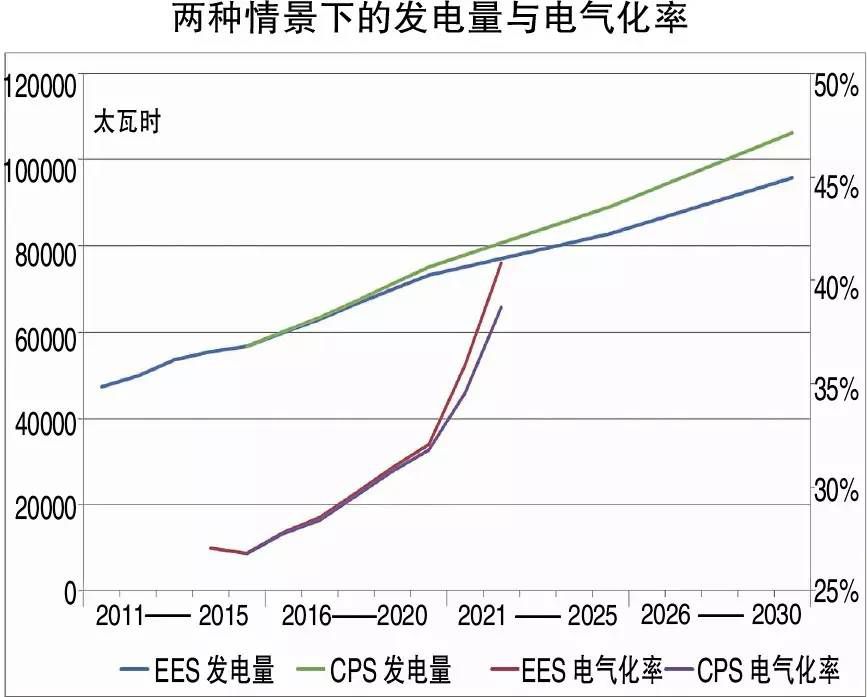 在CPS情景下,发电总量及发电量弹性系数偏高,而电力在终端能源消费中的占比(或电气化率)较低。然而,在EES情景下,发电总量及发电量弹性系数降低一些,但是,电气化率反则提升,因为二次能源转换率提升,终端生活和工业部门能源消费中的电力利用领域和范围更加广泛,从而终端能源消费更加清洁、环保、减排,更有利于建设低碳、环保和可持续的发展环境,实现"美丽中国"的目标。