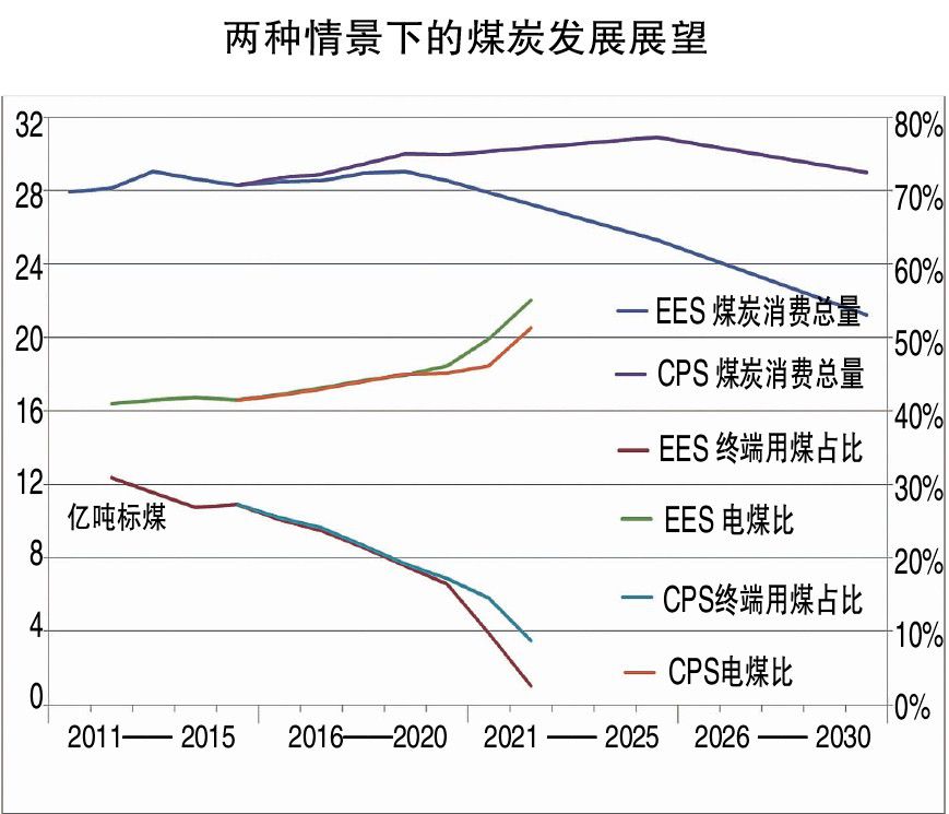 煤炭是推动中国能源转型的关键环节。在CPS情景下,煤炭需求于2019年基本进入高峰平台,并于2025年达到峰值(约31亿吨标准煤);而在EES情景下,煤炭需求于2019年便达到峰值(29亿吨标准煤),之后明显下降,无高峰平台。