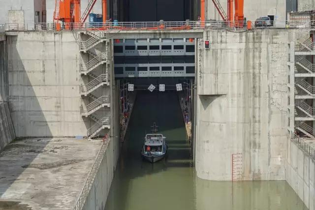 随着螺母柱和齿条停止转动,“电梯”承船厢室安稳静止,待下闸首工作门与船厢对接等一系列标准流程检查完毕后,“川云号”驶出承船厢室奔向下游而去,首次带船试验圆满结束。