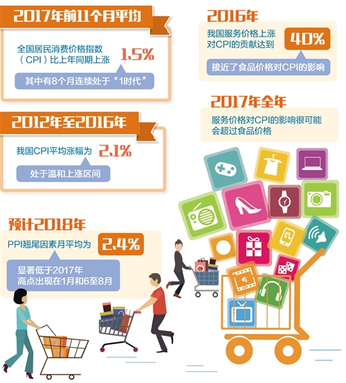 国家统计局日前公布数据显示,2017年前11个月,全国居民消费价格指数(CPI)平均比上年同期上涨1.5%,其中有8个月连续处于“1时代”,处于1.2%至1.9%之间。从2017年全年看,我国物价水平总体上表现温和,完成年初制定的全年物价调控目标已无悬念。