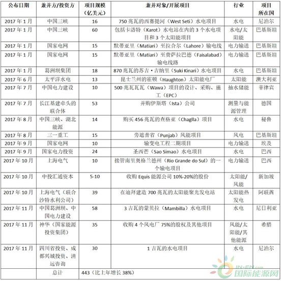 2017年中国在可再生能源、新能源、电网领域的主要投资项目
