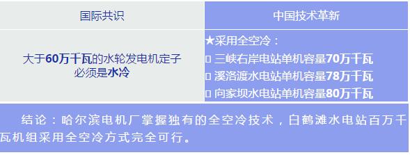 “在三峡右岸电站和地下电站机组中,哈尔滨电机厂设计制造的6台70万千瓦水轮发电机是在突破国际上认为大于60万千瓦水轮发电机应当采用定子水冷的技术,实现世界首创的采用定转子全空冷技术,受到广泛欢迎,随后建设运行的溪洛渡水电站单机77万千瓦、向家坝水电站单机80万千瓦机组等都是采用世界首创的定转子全空冷水轮发电机,运行良好。经过计算与模型实验,白鹤滩水电站100万千瓦水轮发电机采用全空冷技术完全是可行的”梁维燕院士自豪地说,“白鹤滩水电站是世界第二大水电站,但白鹤滩水电站即将安装的却是世界上最大的水轮发电机组。”