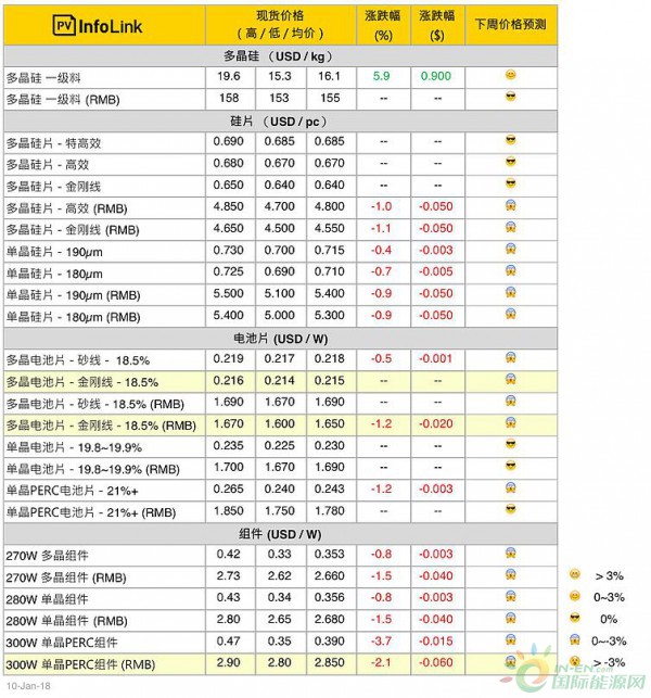 多晶金刚线硅片供应量仍逐月提升,然在市场整体供应量仍略为紧张的情况下,多晶硅片价格仍然相对稳定,本周持稳在每片4.5 - 4.65元人民币,海外0.64元美金。