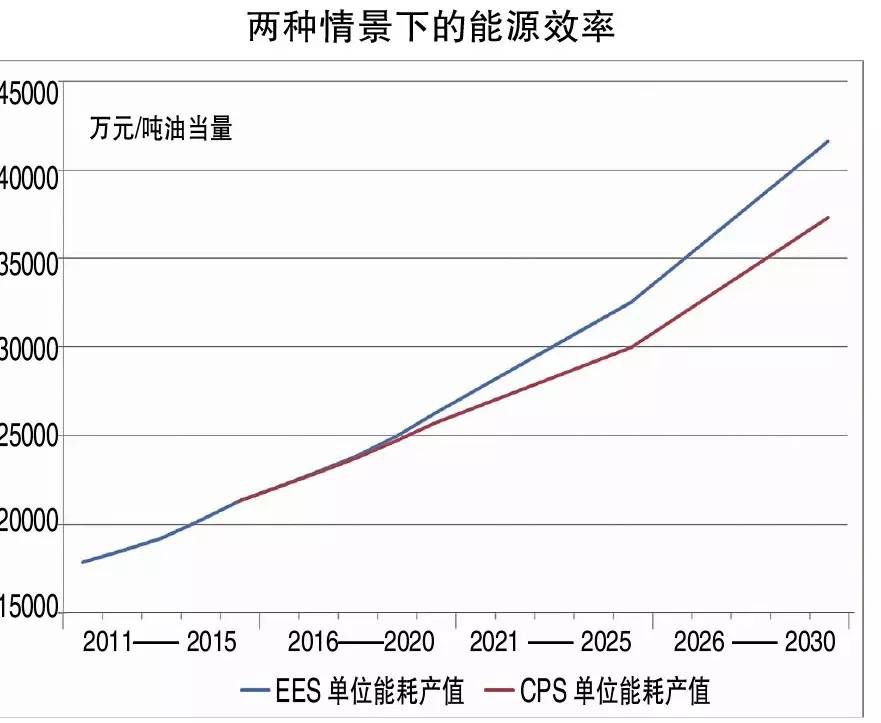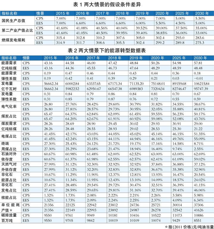 推动能源转型的另一重要途径是能源效率。显然,我们对EES情景下的能源效率做了较高的假设(见表1),并认为在持续推动以上海外高桥第三发电股份公司的2台百万千万机组的276克/度或新机组251克/度为代表的国内先进燃煤发电效率、三大产业能耗和能源消费结构调整上是可以实现的。因此,单位油当量能耗的产值高于CPS情景下的产值。到2030年,CPS情景下的每吨油当量产值(以2011年不变价格计算)为37306元;而EES情景下,这一产值可达到41626元,比前者高近10%。