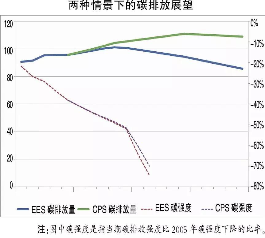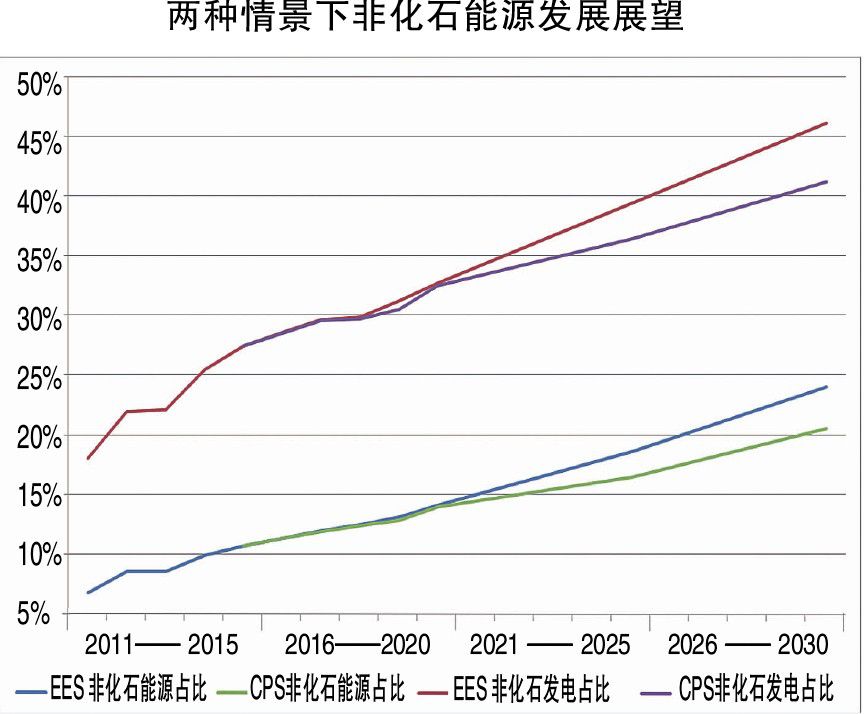 在上述两种情景下,非化石能源占一次能源消费比例和非化石能源发电占发电量的比例均逐年增加。其中,CPS情景下的非化石能源占比较低,提升较慢,到2030年仍可达到20%左右的政策目标;而EES情景下非化石能源的占比更高,增速较快,到2030年非化石能源占比达到24%,比CPS情景高近4个百分点。非化石能源发电的占比在EES的情景下,增长更为突出。仅就非化石能源的一次能源占比看,可提前四年左右实现中国对外承诺的政策目标。我们认为,这是一个带政策条件、却可努力实现的目标。